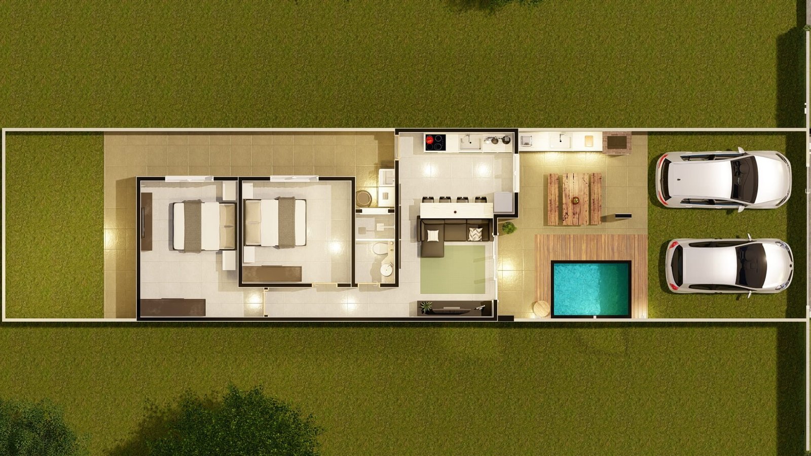 Residência térrea projetada para terreno mínimo de 6x25m. O projeto contém sala de estar e cozinha integradas, dois quartos, um banheiro social, área de serviço, um espaço gourmet na fachada da casa, próximo a cozinha, possibilitando a ligação entre esses dois cômodos, área para piscina, garagem para dois carros e varando nos fundos da residência.