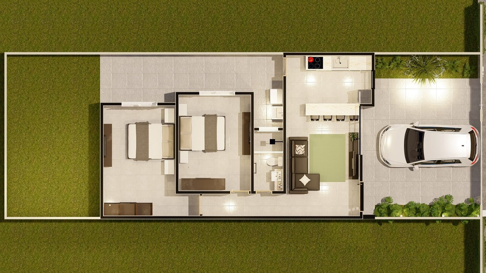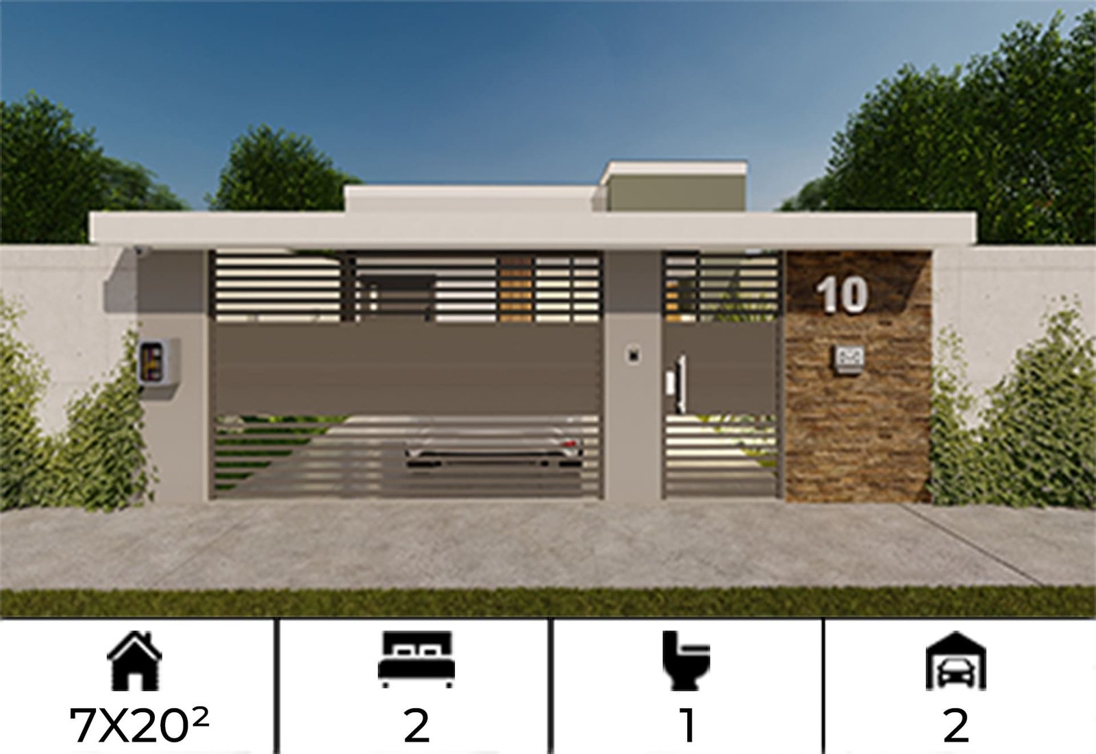 Residência térrea projetada para terreno mínimo de 7x20m. O projeto contém uma sala de estar integrada com a cozinha, banheiro social, dois quartos, área de serviço, uma varanda nos fundos e espaço na frente do terreno para a garagem.
